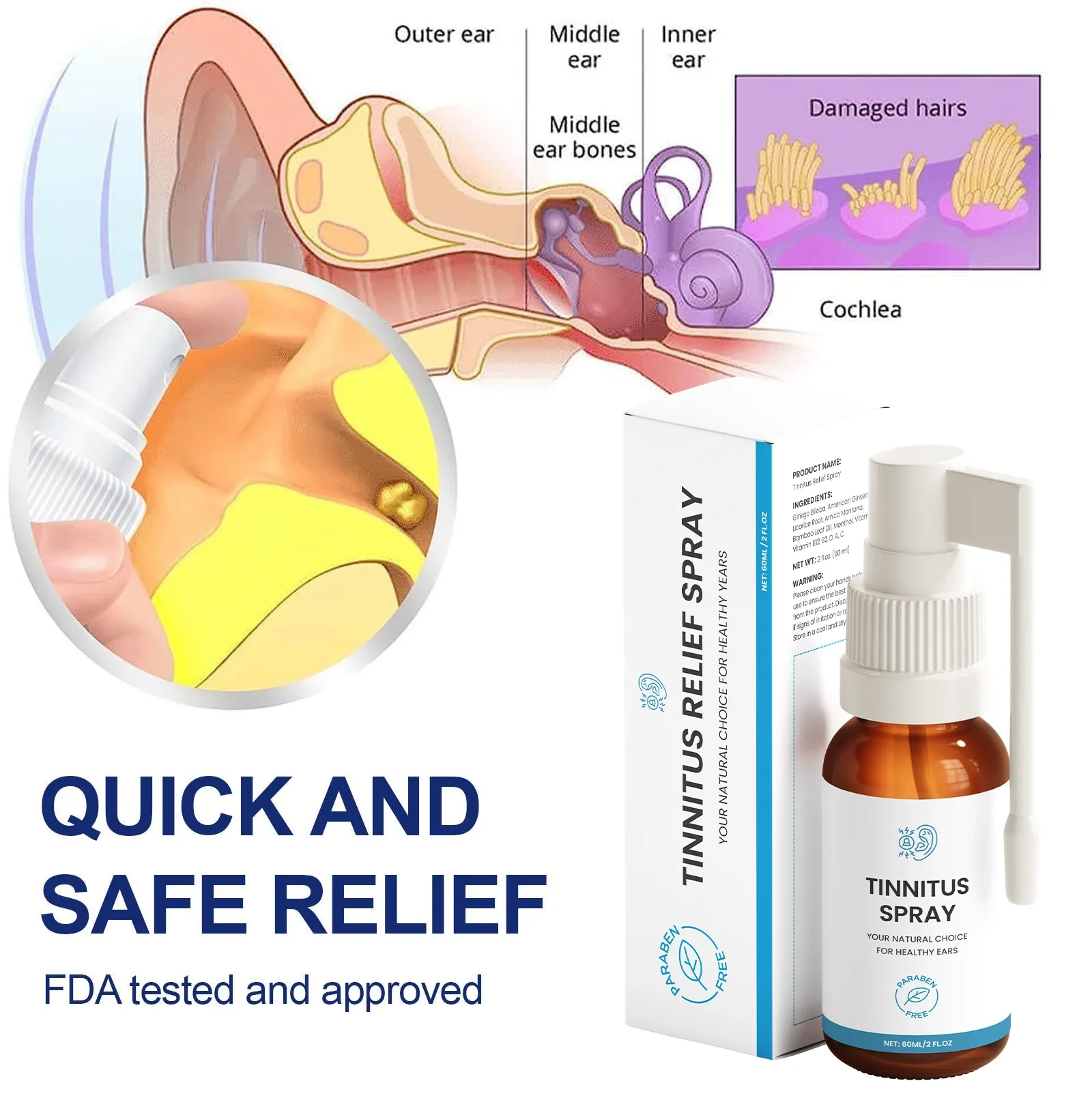 Tinnitus Relief Spray is highly recommended for the treatment and relief of symptoms of otitis externa, eczema, tinnitus, hearing loss or impairment, otomycosis, and other bacterial, viral infections and inflammation.